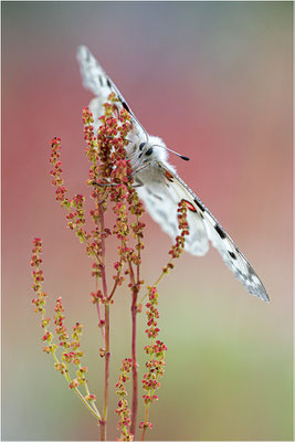 Gestern früh hab ich einen Tintenfleck-Weißling fotografiert, der unter einem Baum am Grashalm schaukelte. Entdeckt hatte ich ihn auf einer Fahrradrunde, bei der ich eigentlich noch auf Auroras oder Landkärtchen gehoffte hatte, was aber vergeblich war. Musste dann also der Weißling herhalten. Dummerweise hatte ich die Pflanzenklammer vergessen, die lag noch irgendwo bei den ausgepackten Sachen und hatte den Weg zurück in den Fotorucksack noch nicht gefunden. Wegen des Windes hab ich dann auch gar nicht erst versucht, einen größeren Maßstab aufzunehmen. Gefällt mir aber auch so ganz gut.