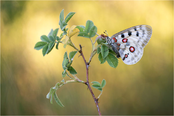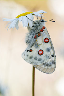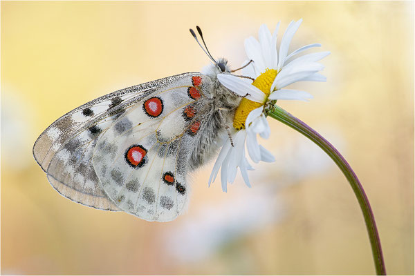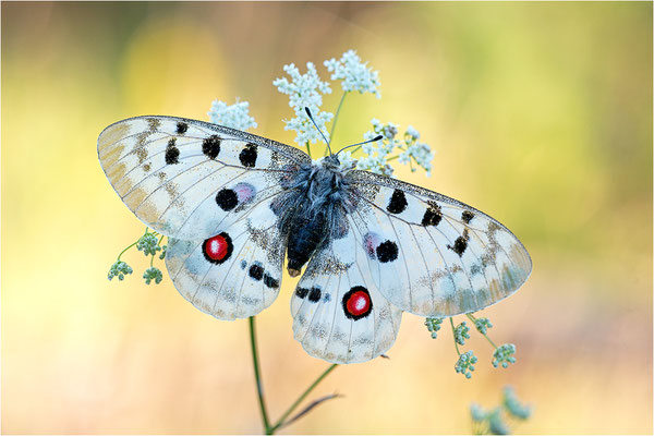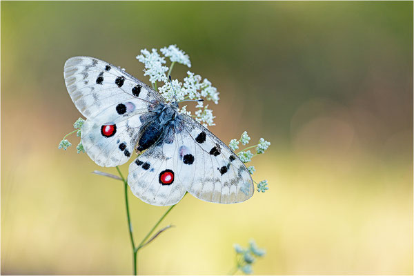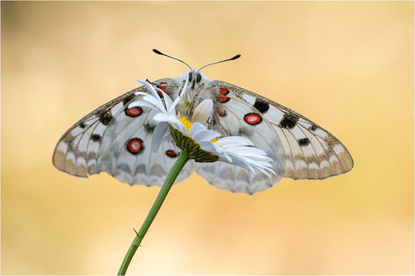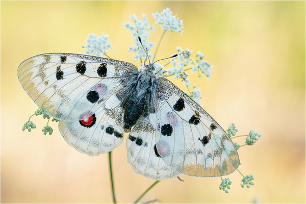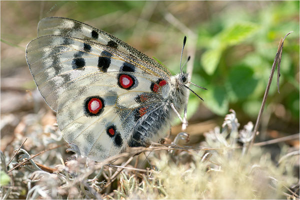 Auf dem Rückweg aus dem Norden machte ich noch an der schwedischen Ostküste halt, der Apollos wegen. Hat geklappt, es gab Falter. Die zweite Unterart des Jahres - hatte ich schon 2021 fotografiert. Hier aber von einer anderen Location mit richtig vielen Individuen, die da tagsüber um die Felsen und entlang der Waldwege tanzten. Abends waren sie denn wech. War ewig sonnig und warm und immer, wenn ich ein frisches, sitzendes Exemplar fand, flog es dann wieder weg und ward nicht mehr gesehen. Nur die gerupften, mit kaputten Flügeln, waren zu finden, die wollte ich aber nicht fotografieren. Morgens versuchte ich dennoch mein Glück und fand, leider fast zu spät, ein schon aufgewärmtes Weibchen - dennoch besser als nüscht.