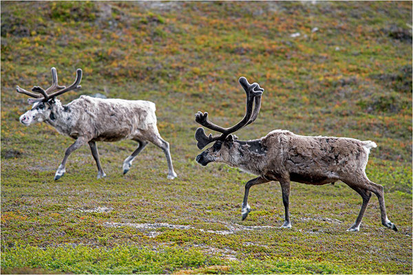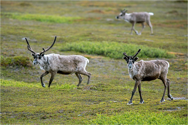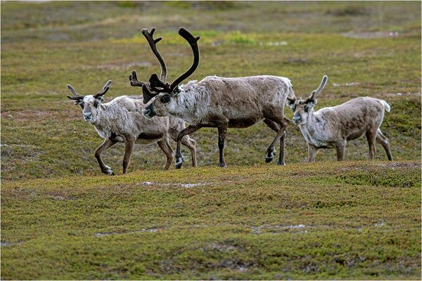 Heute hab ich einige der Rentiere, die mal nicht direkt an der Straße rumlungerten, wie üblich. Hier aus Norwegen, kurz vor der finnischen Grenze. Alles Männer, alles ohne Licht in Sturm und Nieselregen, alle recht struppig und respeklos. In die Kamera glotzend loszustrullen ist auch so ein Verhalten, das gut zu ihnen passt.