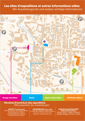 In Wissembourg kostet der Besuch der vier Ausstellungsorte für das ganze Wochenende einmalig fünf Euro, es lohnt sich aber nach meiner Erinnerung vom letzten Mal. Die genauen Orte sind auf der Karte in der Broschüre zu sehen. Als Beispiel hier die Adresse vom zentral gelegenen Rathaus: 11 Place de la République, 67160 Wissembourg.