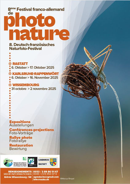In Rastatt hängen die Bilder der Teilnehmenden im Foyer des Landratsamtes vom 06.10. - 17.10.2025. Vernissage ist am 06.10. um 16 Uhr. Zeitgleich läuft eine Ausstellung im Naturschutzzentrum Karlsruhe-Rappenwört, ohne gesonderte Vernissage. Die Ausstellung in Karlsruhe endet erst am 16.11.2025. Und am Wochenende 31.10. - 02.11.2025 findet das Festival in Wissembourg an insgesamt vier Ausstellungsorten im Stadtzentrum statt. Ich bin in Rastatt mit fünf, in Wissembourg mit zehn Bildern dabei und freu mich so allgemein und besonders auf Wissembourg (da hat es mir vor zwei Jahren sehr gefallen).
