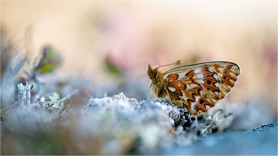 Freijas Perlmuttfalter war die einzige der nordischen Arten, die ich finden und fotografieren konnte. Drei oder vier Stück auf der ganzen Reise, obwohl die Art mit größeren Lücken in ganz Skandinavien verbreitet ist. Ich schieb die Schuld mal dem Wetter zu und nicht meinen fehlenden Suchfähigkeiten. Die Bilder stammen bis auf die ersten beiden finnischen Exemplare alle aus Nordnorwegen. Wenn ich mal einen hatte, wurde der denn eben in allen denkbaren Varianten fotografiert. Wobei - so sehr viel Kreativität war da nun nicht dabei, weil ich ständig Angst hatte, er könnte gleich wieder wegfliegen. Vier weitere skandinavische Arten hatte ich auf dem Wunschzettel, dazu noch einige, die es auch in den Alpen gibt. Gesehen hab ich dann noch die drei großen Arten der Gattung Argynnis und den Mädesüß-Perlmuttfalter, bei dem Fotos am Wetter scheiterten.