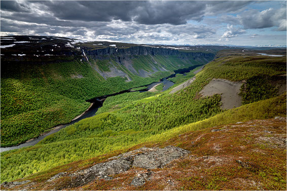 Ich sah einen Canyon. Für mich als Canyonanfänger sah der ziemlich imposant aus. Die Wirkung wurde dadurch noch verstärkt, dass die umgebende Umgebung eher so leicht hügelig war und man da in Nordnorwegen ja ohnehin meistens bis zur Arktis gucken kann. Und denn steht man da auf so ´nem Berg und auf einmal gehts auf der anderen Seite paar hundert Meter weiter runter, als auf der Seite, von der man so vor sich hin durch die Tundra krabbelnd gekommen war. Und weit und breit ansonsten: Nüscht. Kein Mensch, kein Auto, kein Flugzeug, keine Staße, kein Haus. Wind, ja, paar Mücken auch, aber sonst nüscht. Auch kein Licht, dafür aber auch kein Regen. Und das ist ja sogar besser als nur kein Licht. So rückblickend betrachtet weiß ich auch gar nicht, warum ich da nicht einfach sitzen blieb. Obwohl das am Abend, unten am Fluss dann auch ganz hübsch war. Da fuhr dann zwar der eine oder andere Norweger mit einem Holzkahn zum Angeln, ansonsten war da neben dem Fluss und mehr Mücken und paar Bäumen im Wind auch nüscht zu sehen, was in irgendeiner Weise geeignet gewesen wäre, den Eindruck der Alleinigkeit auf der Welt zu stören. Ich wäre dann jetzt so weit, da wieder hin zu wollen.
